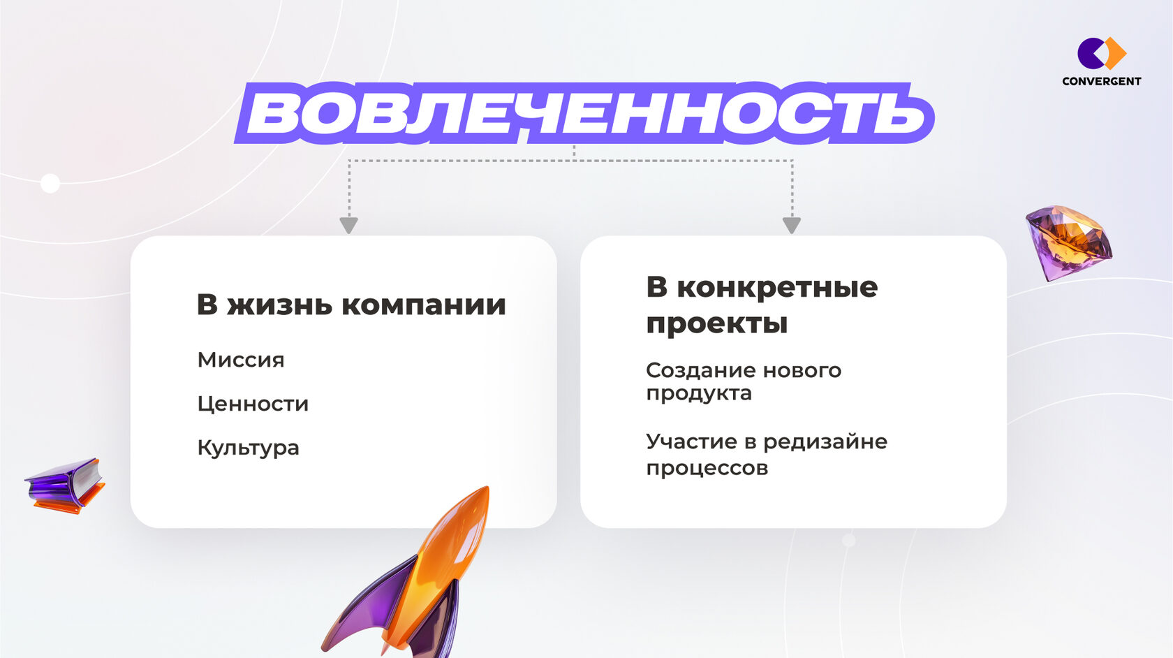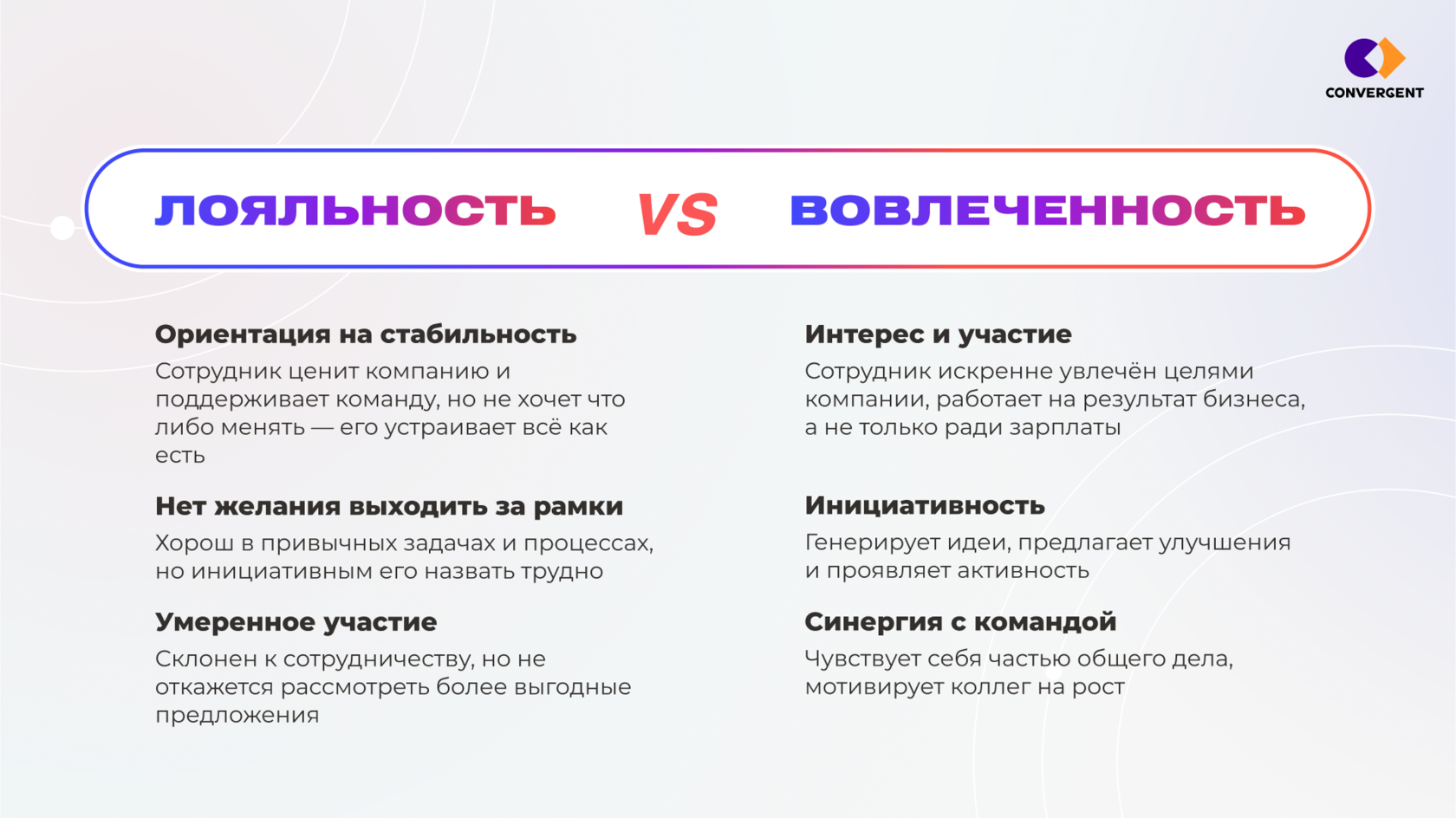 Вовлечённость сотрудников — это не просто модное слово, а реальный инструмент для улучшения бизнеса. Мы в Convergent знаем, как превратить абстрактные идеи по повышению вовлечённости в конкретные шаги, которые дадут измеримый результат. Узнать больше о наших подходах и вдохновиться масштабными кейсами, которые помогут оживить корпоративные процессы и сделать их по-настоящему эффективными — можно на нашем сайте.