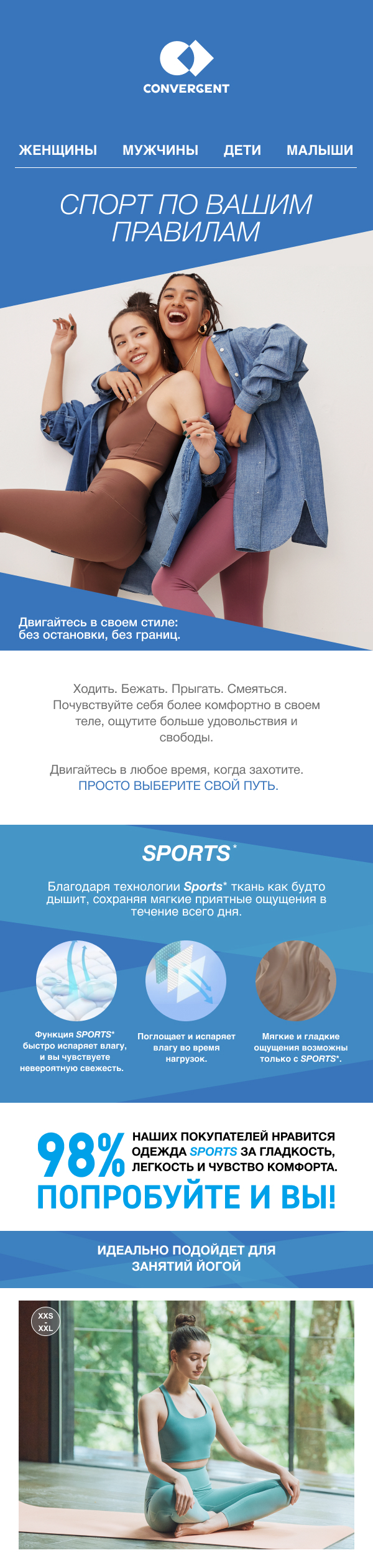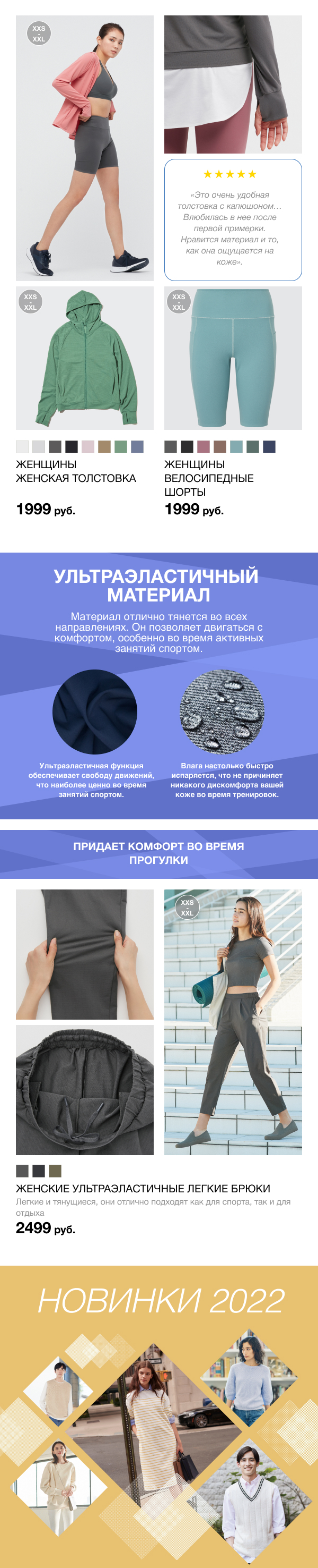 Акцент на важных свойствах тканей и особенных технологиях как в информационных, так и в продуктовых письмах увеличивает осведомлённость о бренде и лояльность подписчиков (особенно для спортивных и туристических брендов)