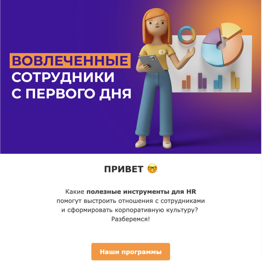 Продуманная рассылка с уникальной визуальной айдентикой и доброжелательным, мотивирующим Tone of Voice увеличивает вовлечение команды и её лояльность