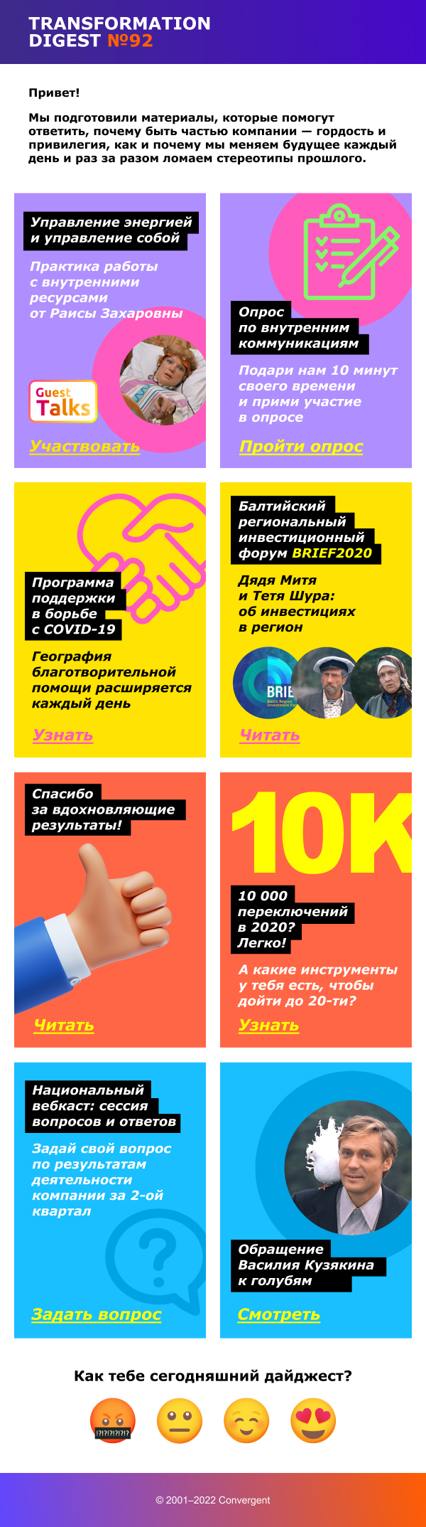 Не все компании уделяют время созданию корпоративных рассылок. Опыт Convergent показал, что это направление внутреннего маркетинга особенно важно в крупных корпорациях. Регулярные письма с новостями компании, опросами и интерактивами демонстрируют сотрудникам её открытость и помогают укрепить корпоративную культуру