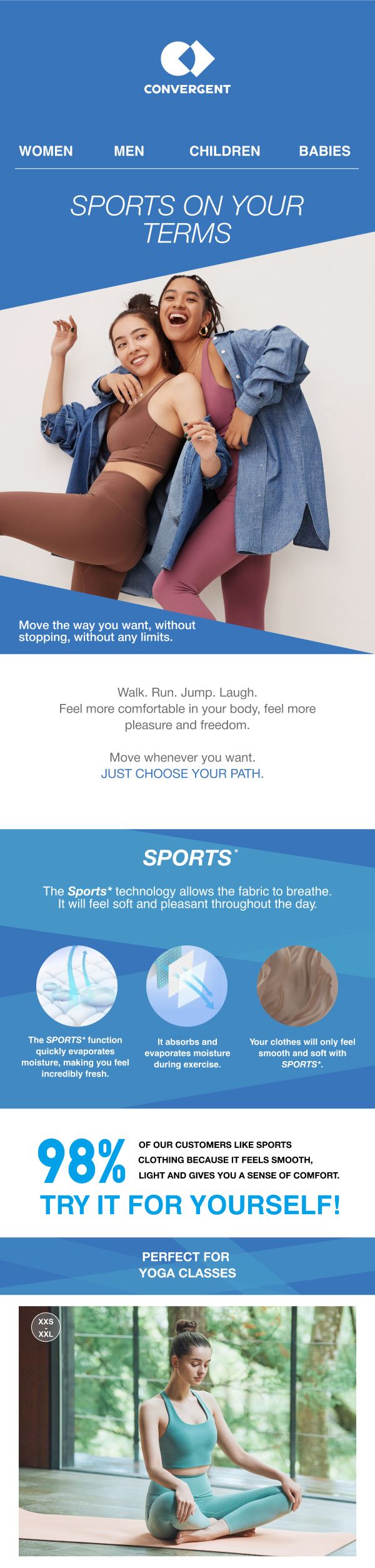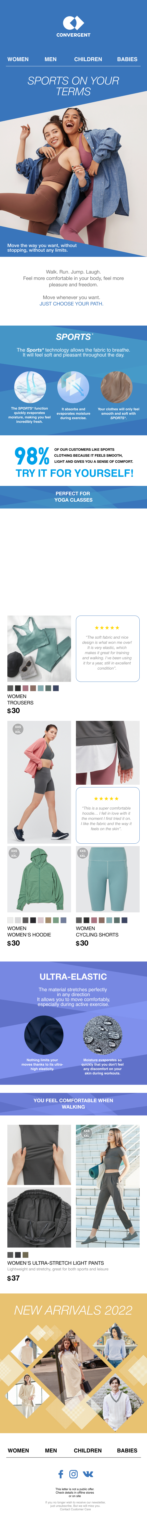 The emphasis on the key properties of fabrics and special technologies in both informational and product emails increases brand awareness and subscriber loyalty (especially for sports and travel brands)