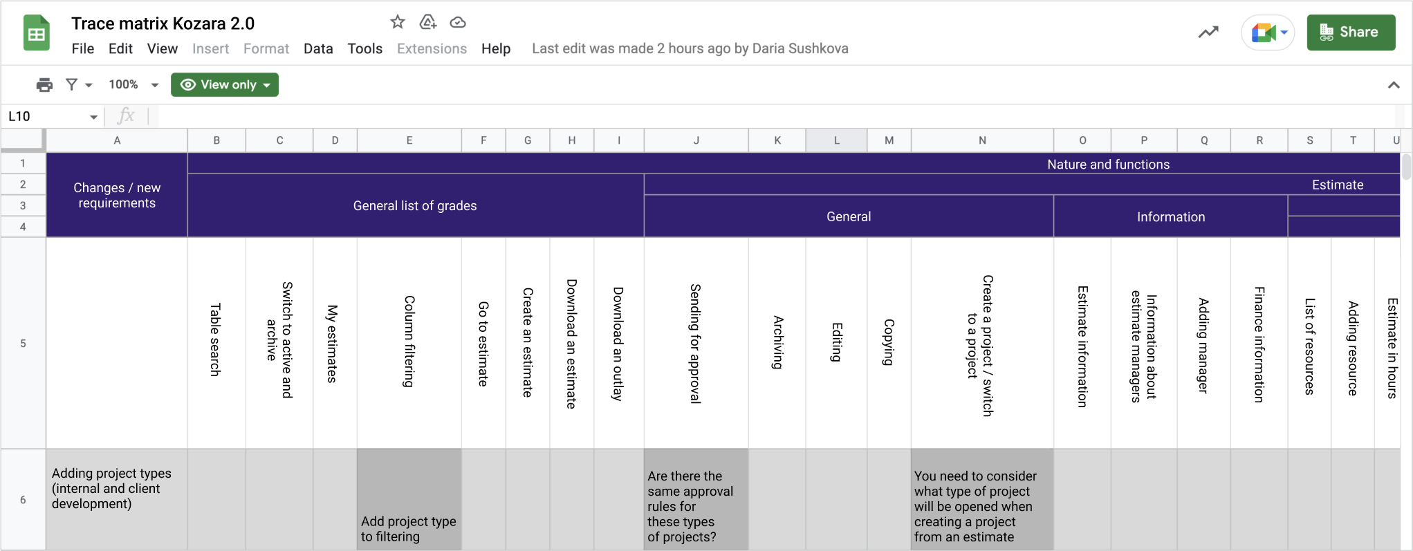 In addition, we use a trace matrix to map how functions affect each other and avoid errors at the implementation stage.