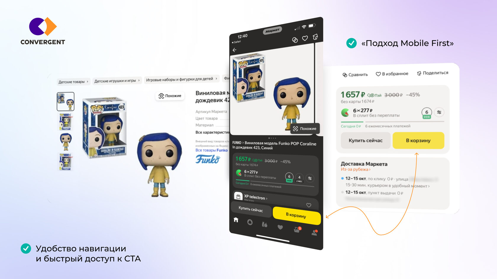 Пример: В десктопной версии сервиса Яндекс.Маркет кнопки «Купить сейчас» и «В корзину» расположены на первом экране страницы справа от изображения, при скролле закрепляются в верхней части экрана. В мобильной версии эти кнопки перенесены и зафиксированы в нижней части экрана. Такое решение обеспечивает быстрый и удобный доступ к ключевым действиям на всех устройствах.
